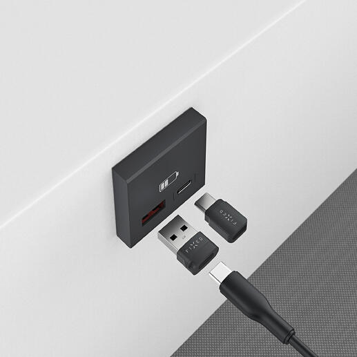 Selten und genial praktisch: der 4-in-1-­Ladestecker mit integriertem USB-C-­Kabel und Qi-Ladepad.