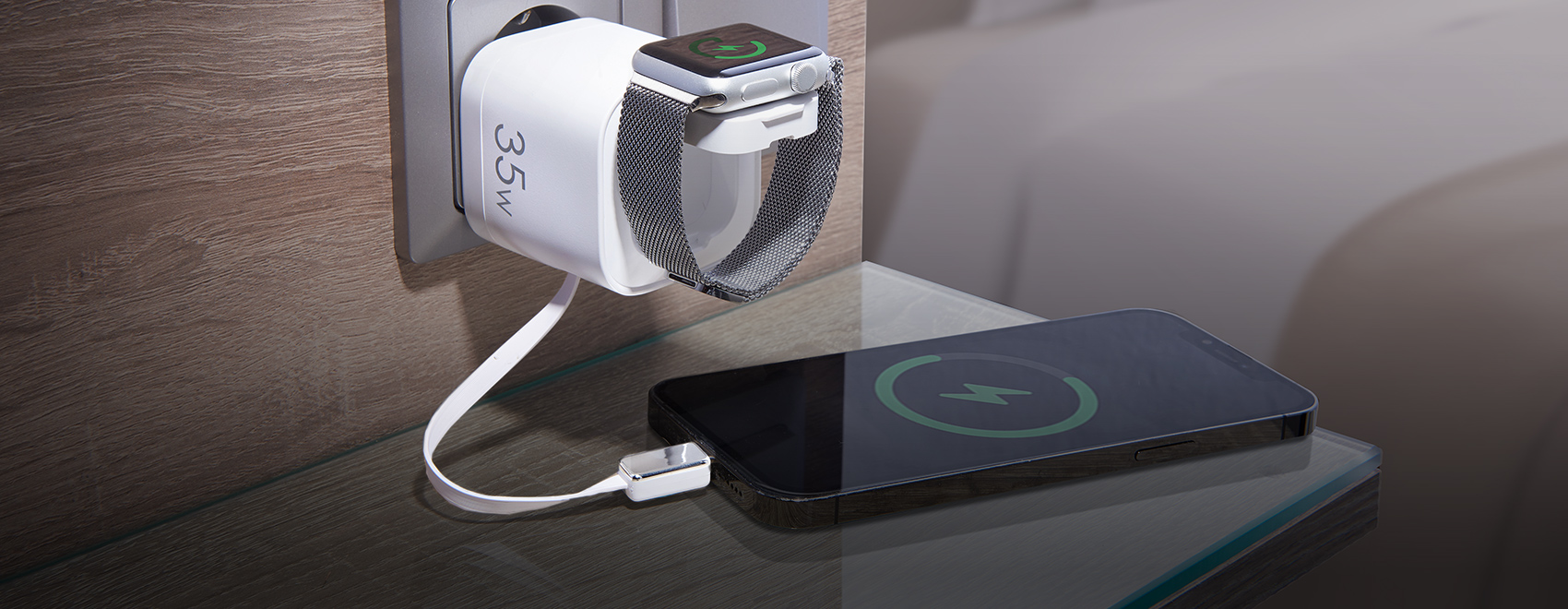 Ambiente-Wandleuchte und USB-Lade-Hotspot zugleich. Lädt bis zu 4 Mobilgeräte gleichzeitig. Und spendet auf Wunsch warmes, dimmbares Ambiente-Licht.