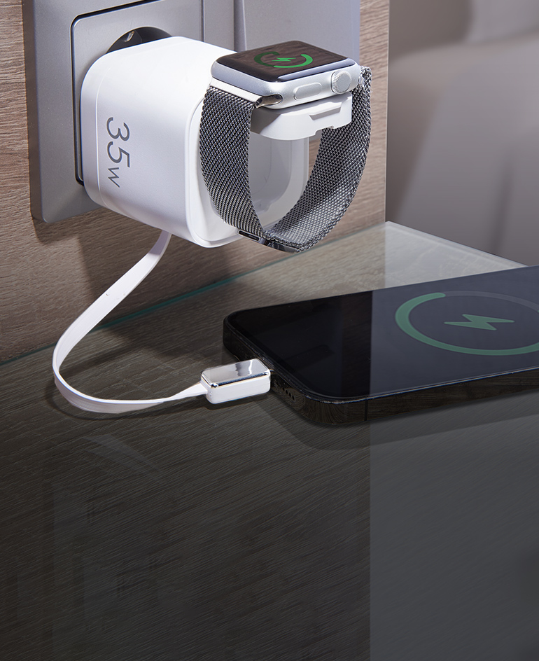 Selten und genial praktisch: der 4-in-1-­Ladestecker mit integriertem USB-C-­Kabel und Qi-Ladepad.