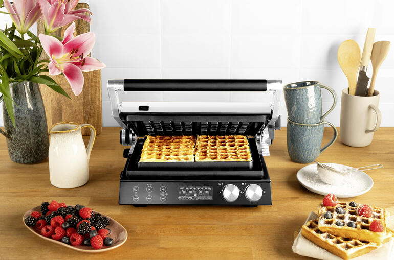 4-in-1 Multitalent: Kontakt- und Tischgrill, Sandwich-Maker und Waffeleisen in einem.