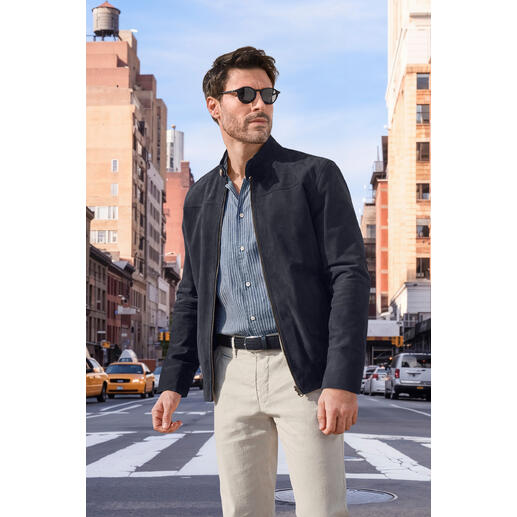 Edle Lederjacke aus samtigem Ziegenvelours auf der einen, strapazierfähige City-Jacke aus wetterfestem, wasserabweisendem Nylon auf der anderen Seite: Welchen Look Sie tragen, entscheiden Sie ganz nach Anlass und Stimmung.