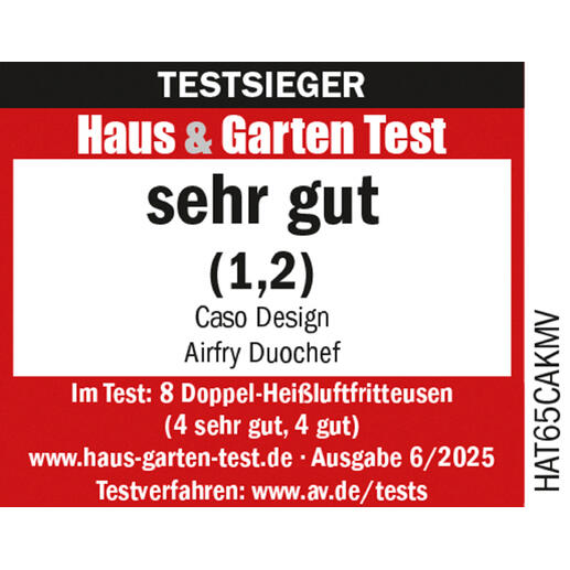 Per Sensortastentipp wählen Sie das benötigte Programm: für rechten und linken Korb getrennt oder für beide gemeinsam. Füllen Sie einfach alle Speisen Ihres Menüs gleichzeitig ein. Die intelligente Elektronik garantiert, dass alles zeitgleich servierfertig ist. Elegantes schwarzes Kunststoffgehäuse Sichtfenstern und Innenbeleuchtung. Sensor-Touch-Display. Misst 43 x 34 x 36 cm (L x B x H), wiegt 9,3 kg. 90 cm-Kabel für 220-240 V/2.200 W. Dekra/GS-geprüfte Sicherheit.** Inkl. 2 antihaftbeschichtete Körbe mit Innenrost, Trennwand, Gerätetür, 1 Back- und 1 Lochblech. Körbe und Bleche spülmaschinengeeignet.
