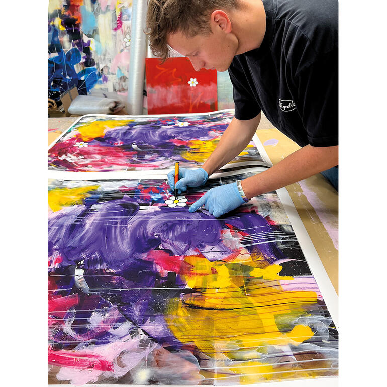 Eine der Margaritenblüten übermalt der Künstler von Hand.